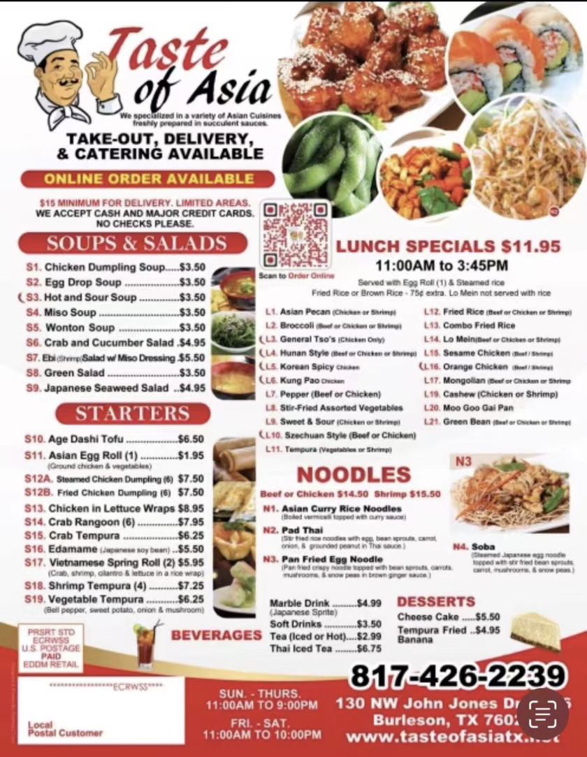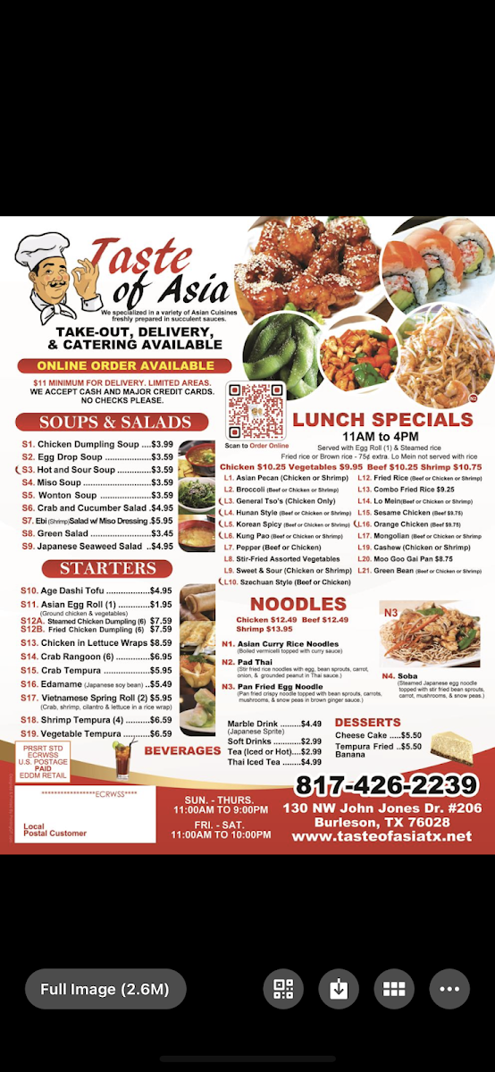 Welcome to Taste Of Asia - Burleson, where authentic Asian flavors await at 130 NW John Jones Dr #206 in Burleson, TX. This vibrant eatery offers a diverse menu that caters to every palate.